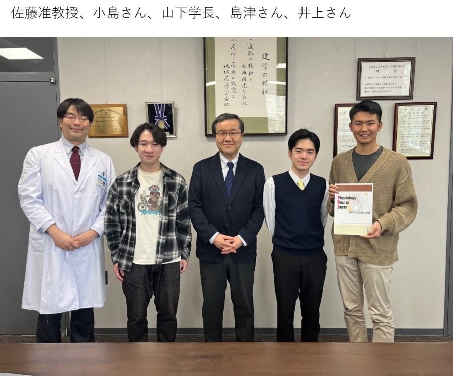 医学・生理学クイズ日本大会(PQJ2025)に3位入賞を果たした、医学部生の井上結翔さん(当分野MD-PhDコース学生)、小島一朗さん、島津大和さんが引率の佐藤准教授と共に学長に入賞報告を行いました。
